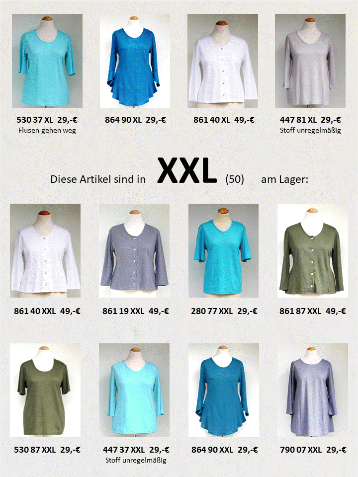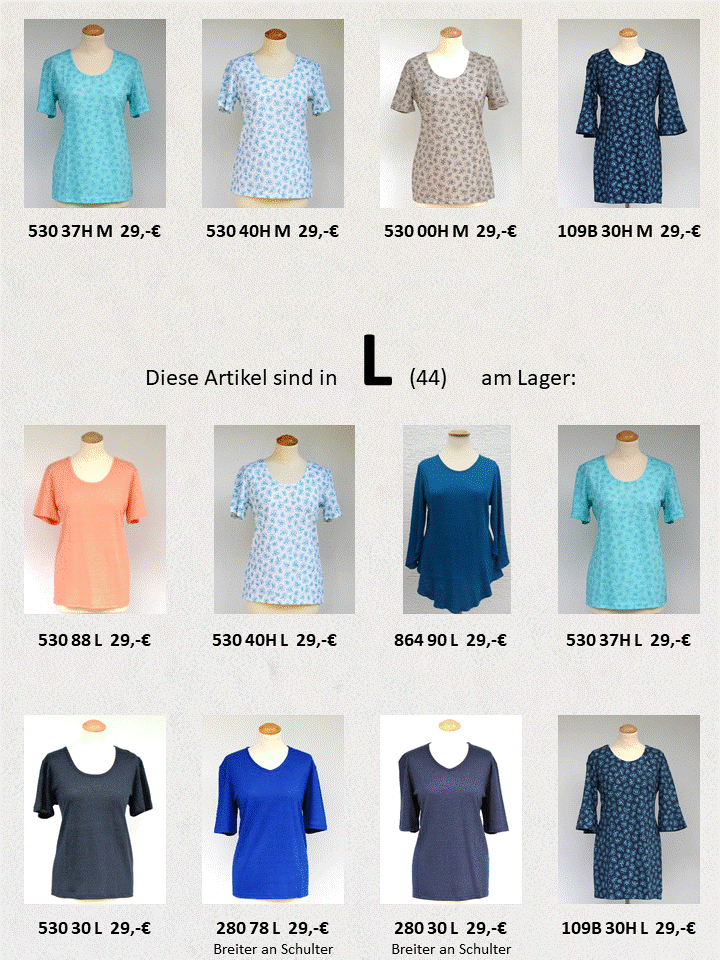 Für Kinder und Herren-Artikel gibt es einen Bestellshop, der mir für die DOB jedoch zu unflexibel und aufwendig ist, um die Ware genau beschreiben und sortieren zu können. Besser ist es, wenn Sie sich die Artikel aufschreiben und mir in einer Mail an Tanja.Bach@web.de mitteilen, was Sie bestellen möchten. Z.B. in der Form: Shirt 100K 90S XL, dann ist die 3-stellige Zahl die Artikelnummer ev. mit K, M oder L für kurzärmlig, mittel oder langärmlig, die 2-stellige die Farbnummer ev. mit S für Schmetterlingsdruck, HS für Heavy-Single .... und Ihre Größe. Damit ist das Kleidungsstück genau definiert und dennoch können Sie leicht einen Wunsch oder eine Frage anfügen.